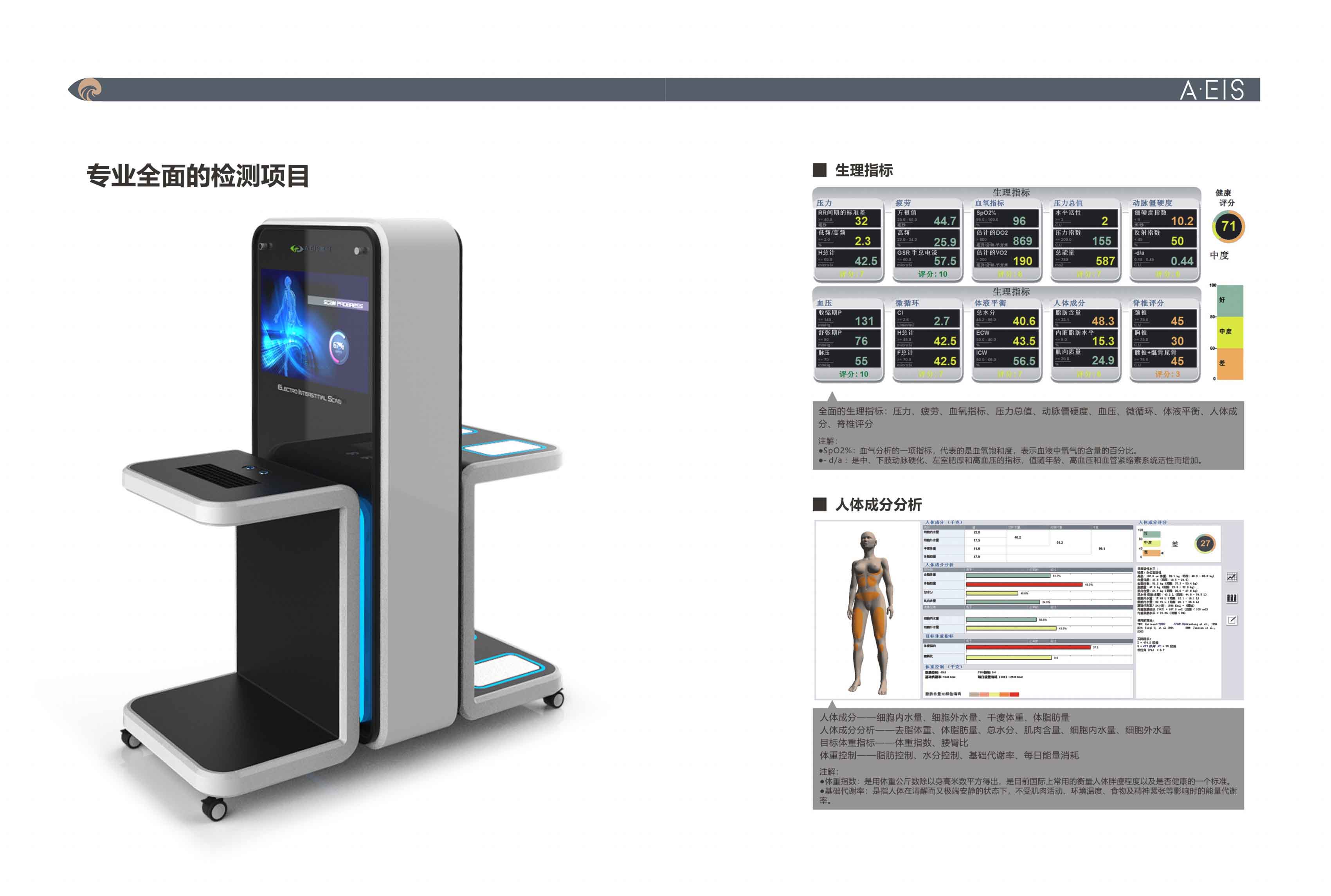 鷹演人體電阻抗測量儀基礎版是一款兼具專業性和大眾性的全自動智能健康管理系統,是由多頻段人體3D分析評估系 統、數字脈波分析、血流動力學評估和自主神經系統評估等組成的強大的智能健康管理集成系統。其中的BC-OXI和 Wellness Pro,是整合現有權威統計篩選評估的最新和最先進的工具。經過科學驗證,人體電阻抗測量儀基礎版提供了 一種智能、便捷、簡單、無創的檢測方法,可以在3分鐘內測試受檢者的多項靜態和動態生理指標。適應于小型的健康 中心、健康會所、社區中心、養老中心、醫學美容中心、健身中心、SPA中心、瑜伽和體育運動中心等,對受檢者進行 有力的健康檢測、健康監測、健康指導,是健康管理的得力工具和助手。
