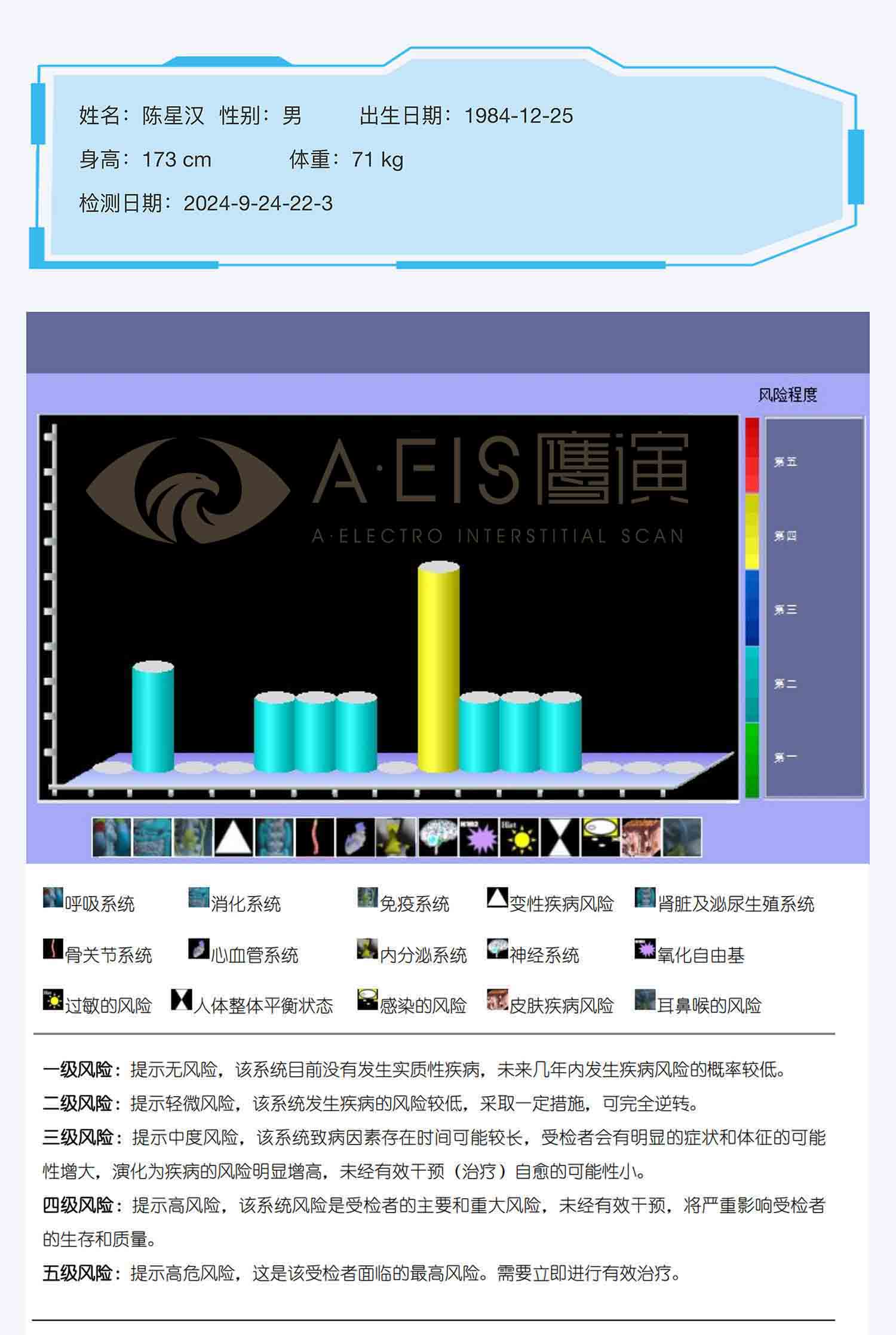 鷹演云健康篩查系統(tǒng)采用了先進(jìn)的低壓直流電刺激感應(yīng)技術(shù),僅需3分鐘,就能對(duì)人體15大系統(tǒng)、22個(gè)體區(qū)、286項(xiàng)指標(biāo)進(jìn)行全面檢測(cè)。這一技術(shù)通過(guò)向人體發(fā)送微弱的電信號(hào),利用人體組織對(duì)電信號(hào)的響應(yīng)特性,全面覆蓋從基礎(chǔ)生理指標(biāo)到復(fù)雜疾病風(fēng)險(xiǎn)的各個(gè)方面,實(shí)現(xiàn)精準(zhǔn)檢測(cè)。無(wú)論是心血管系統(tǒng)、免疫系統(tǒng)、消化系統(tǒng)還是神經(jīng)系統(tǒng),鷹演云健康篩查系統(tǒng)都能為您提供詳盡的數(shù)據(jù)報(bào)告,讓您對(duì)自己的身體狀況了如指掌。