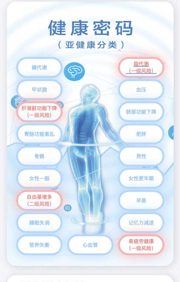 A版:專業版報告,開放人群:健康管理師,醫生等專業人士。專業,系統的評估身體的各大指標,并且自帶解讀報告功能,解決方案,是有效的健康管理的工具。