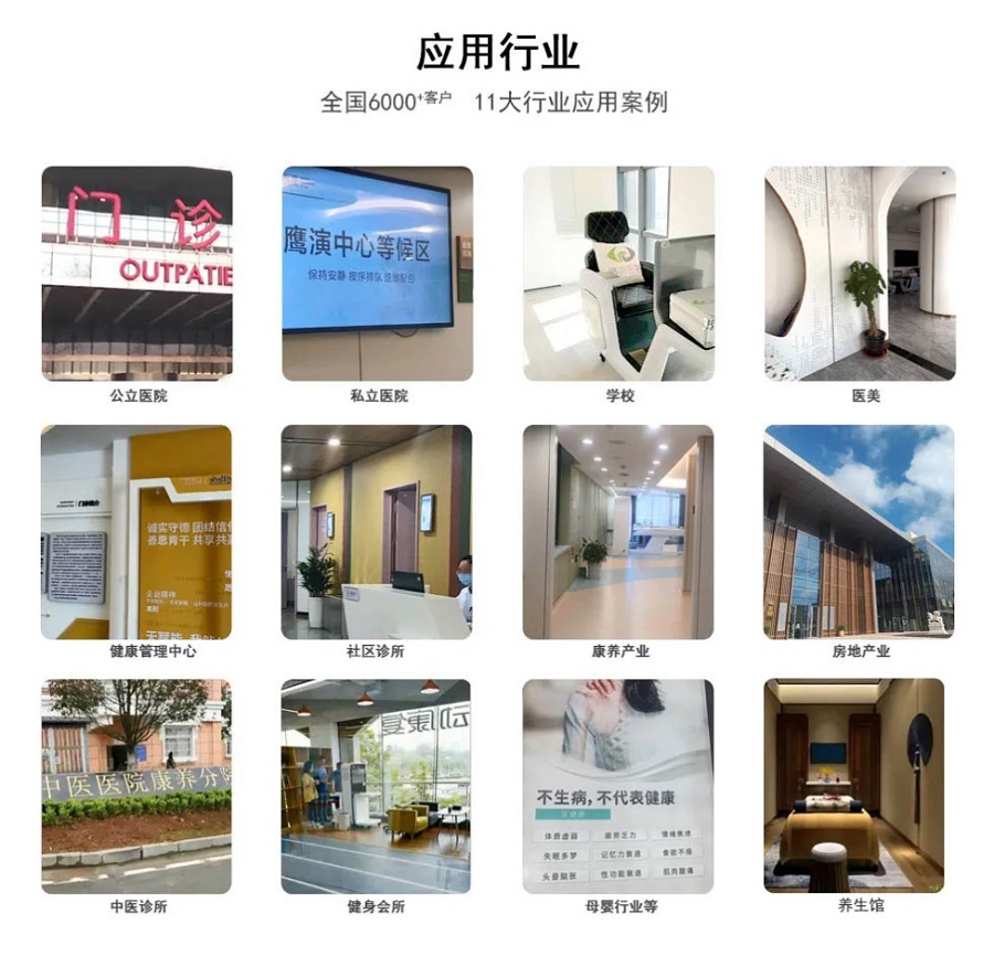 鷹演小精靈(全身健康掃描系統)在慢性病早篩領域享有很高的品牌度和美譽度,累計客戶已經突破6000家,如解放軍總醫院、北京大學人民醫院、北醫三院、湘雅醫院、廣東省中醫院、山東大學齊魯醫院、解放軍309醫院等醫院,累計上千萬慢性早篩案例,客戶更是從傳統的醫院拓展到房地產、社區、體檢中心、美容院、健康會所、戒毒所等地。